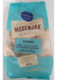 Proizveden od brašna, invertnog sirupa, meda, sredstava za narastanje i prirodnih mlevenih začina. Blago preliven šećernom glazurom te tako zadržava ukus i aromu svojstvenu medenjaku. Energetska vrednost 366,4kcal. Pakovanje od 150g, 200g, 400g, 500g i 1kg.