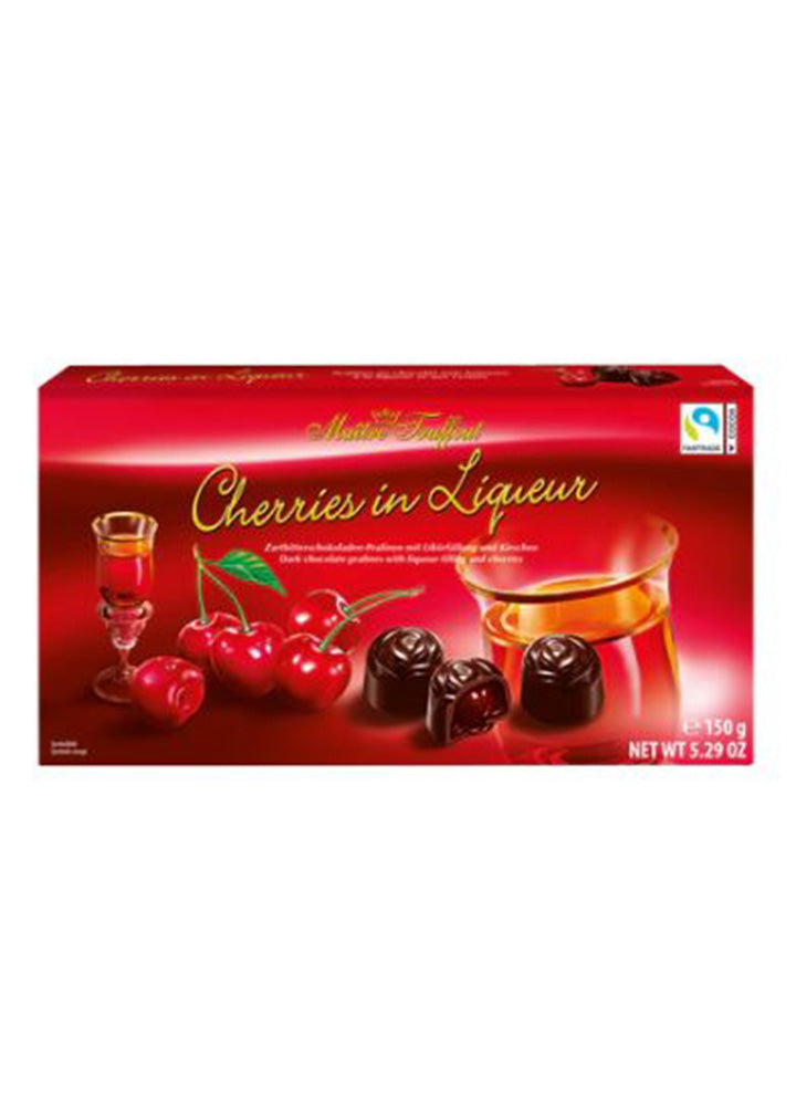 Delicate dark chocolate pralines from Maître Truffout with cherries and liqueur filling.