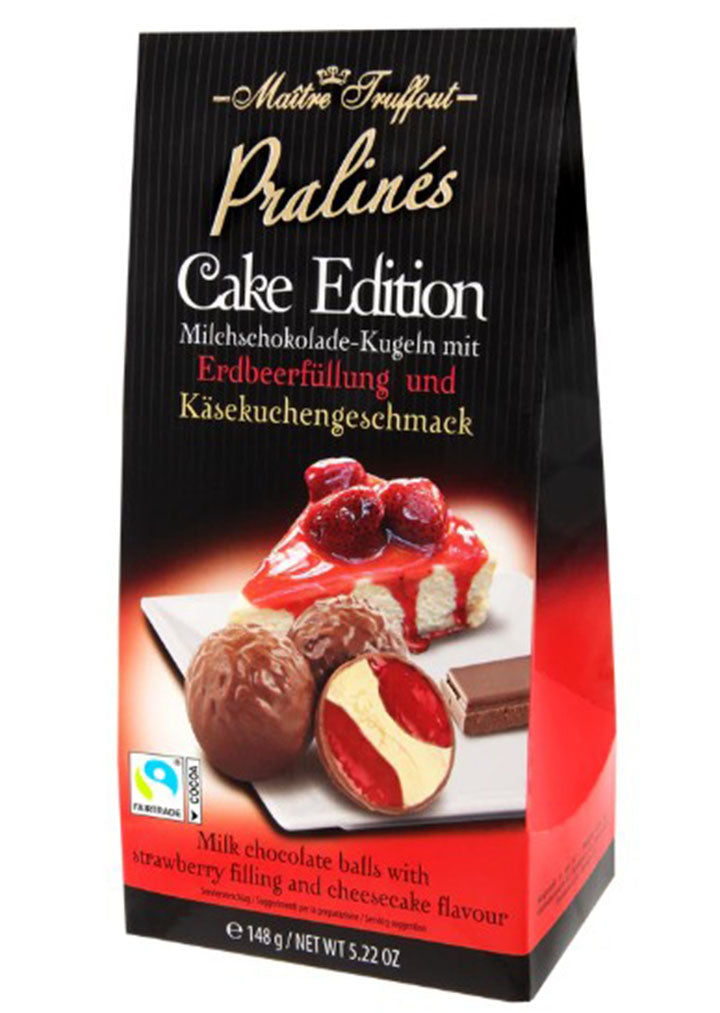 Maître Truffout Cake Edition kombinuje praline i tortu u ukusnoj kuglici od pralina. Male poslastice od mlečne čokolade i fila za tortu od jagoda i sira ubrzavaju rad srca ljubitelja. U uzbudljivom dizajnu, praline su sada sertifikovane i oznakom Fairtrade.
