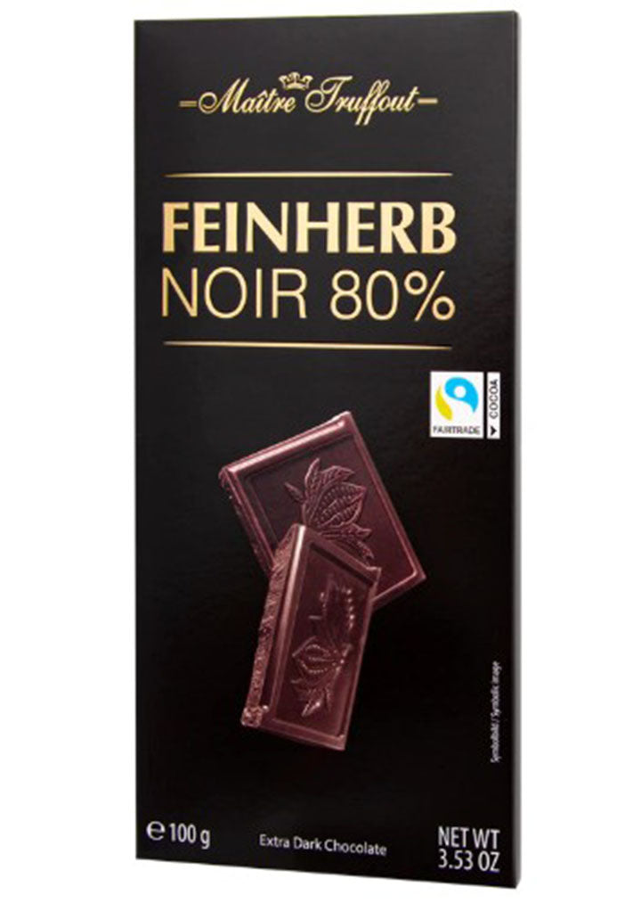 Premium extra dark chocolate from Maitre Truffout with a very high cocoa content of 80%. Finely bittersweet chocolate.