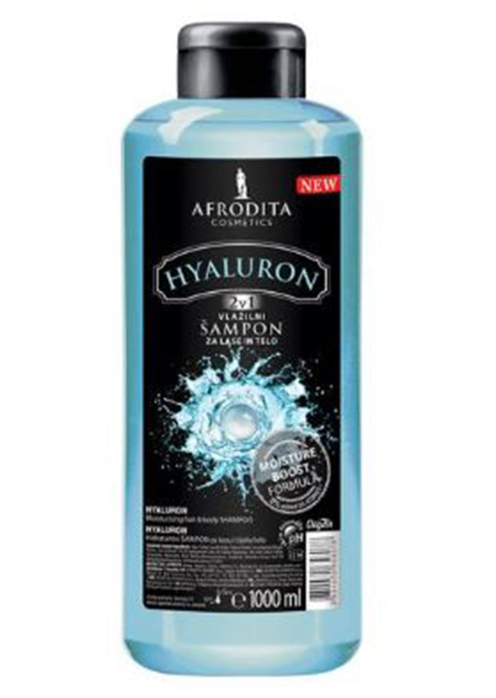 Afrodita Šampon za kosu i telo HYALURON 1000mlHidratantni šampon za kosu i telo HYALURON 2u1. Patentirana hijaluronsa kiselina, 100 % prirodnog porekla, hidrira kosu i vlasište te blagotvorno neguje kožu tela. Sprečava isušivanje kože i kose te deluje osvežujuće. optimalna pH vrednost . O % silikona. VEGAN. SVEŽINA NADAHNUTA PRIRODOM!