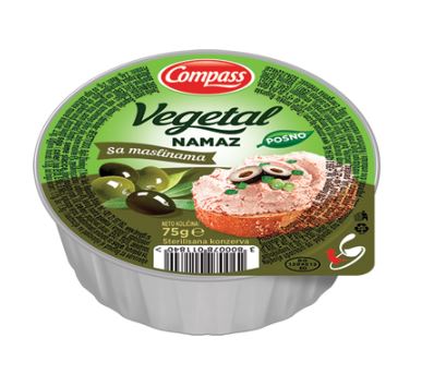 Ukoliko se odlučite da pojedete Compass Vegetal namaz sa maslinama, svaki zalogaj će Vas asocirati na mediteran.Hranljiva vrednost u 100g proizvoda:Energetska vrednost: 925kJ/224kcal,Masti: 21god kojih zasićene masne kiseline:2,6g,Ugljeni hidrati: 6,6g,od kojih šećeri: 1,1g,Proteini:2,4g,So:1,9g.