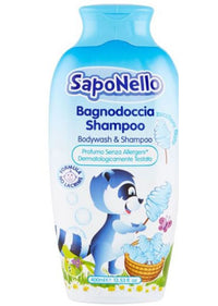 Linija SapoNello brine o mališanima proizvodima posebno dizajniranim za najdelikatniju kožu. Saponello šampon gel za tuširanje nežno čisti dečiju kožu i kosu. Kremasta formula bez suza, koja ostavlja kožu mekom i hidriranom uz poštovanje prirodne fiziološke ravnoteže. Dermatološki i oftalmološki testiran, bez parabena i alergena. Miris secerne vune.