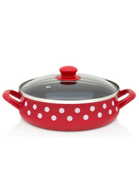 Prečnik (cm): 24Zapremina (l): 3,4Visina (mm): 79Materijal: Emajl na čeličnom limuSa staklenim poklopcemBoja (spolja/unutra): Crvena/CrnaOdržavanje: Ručno i mašinsko pranje Emajlirano posuđe je dugotrajno, otporno na hemijske uticaje i habanje, jednostavno za održavanje. Može se koristiti na svim grejnim telima, uključujući i indukciju.