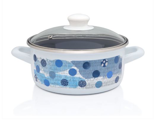 Prečnik (cm): 24Zapremina (l): 4,75Visina (mm): 110Materijal: Emajl na čeličnom limuSa staklenim poklopcemBoja (spolja/unutra): Bela/PlavaOdržavanje: Ručno i mašinsko pranjeEmajlirano posuđe je dugotrajno, otporno na hemijske uticaje i habanje, jednostavno za održavanje. Može se koristiti na svim grejnim telima, uključujući i indukciju.TELO POSUDE je izrađeno od čeličnog lima najvišeg kvaliteta koji omogućava brzo i ravnomerno prostiranje toplote i štedi energiju.UNUTRAŠNJI I SPOLJAŠNJI EMAJL je otporan na habanje i ogrebotine. Izuzetno je gladak, neporozan i sprečava zadržavanje bakterija.RUČICE su ergonomski projektovane i čvrste konstrukcije za sigurno rukovanje posudom.