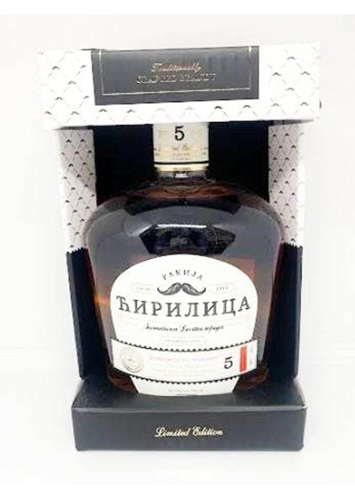 РАКИЈА ЋИРИЛИЦА 5 god staraDESTILERIJA RANOVACЋирилица је природна ракија, добијена двоструком дестилацијом, која сазрева у храстовом бурету и коју карактерише спој пажљиво бираних плодова, претежно аутохтоне сорте у својој пуној зрелости, традиционалног начина производње и модерне технологије. Једна чашица Ћирилице је мера нашег, српског идентитета.