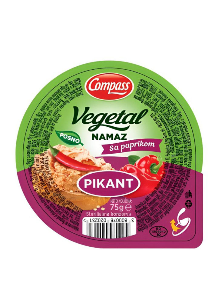 Compass Vegetal Spicy spread with paprika 75gEnergy (kJ): 1117Energy (kcal): 270Fats: 26of which saturated fatty acids (g): 2Carbohydrates (g): 6Proteins (g): 2Salt (g): 1*Nutritional value per 100g of product