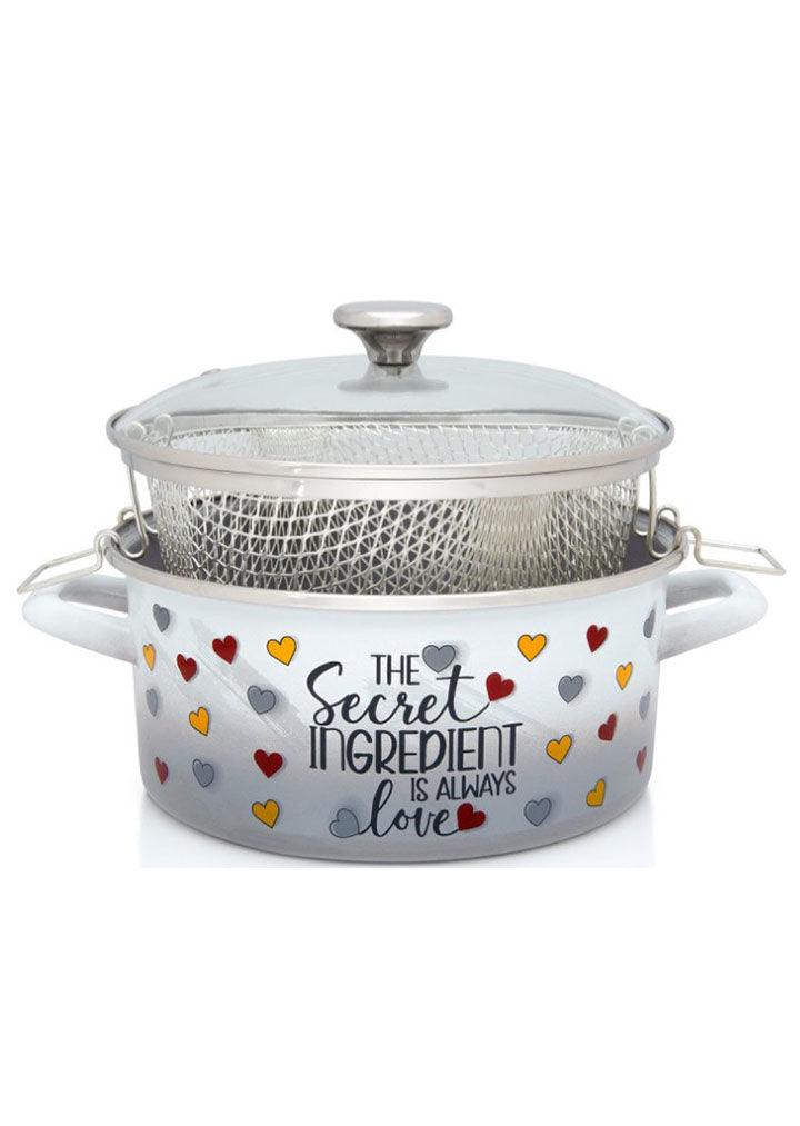 Diameter (cm): 24Volume (l): 4.4Height (mm): 117Material: Enamel on steel sheetWith a glass coverColor (outside/inside): White/GreyCare: Hand and machine wash