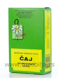 Čaj kod upale želudačne sluzniceSastav:Koren belog sleza (Althaeae radix)Herba podubice (Chamaedryos herba)Cvet kamilice (Chamomillae flos)Koren zečijeg trna (Ononidis radix)Herba kantariona (Hyperici herba)List pitome nane (Menthae piperitae folium)List kupine (Rubi fruticosi folium)Herba trave ive (Teucrii montani herba)Ononidis radixOsobine: Lekovito bilje koje ulazi u sastav ove čajne mešavine sadrži sluzi, asparagin, holin, kalcijum oksalat, pektine, skrob, luteolinske flavonoide, seskviterpenske laktone, triterpene, diterpene, iridoidne monoterpene, antrahinonske derivate hipericin i pseudohipericin, floroglucinske derivate (hiperforin), tanine, ksantone, amino kiseline (GABA), organske kiseline, gorke supstance i etarska ulja (bogata mentolom i azulenom).Aktivni sastojci lekovitog bilja koje ulazi u sastav Čaja kod upale želudačne sluznice pokazuju protivupalno dejstvo, a prisutne sluzi oblažu i deluju zaštitno i umirujuće na iritiranu sluzokožu želuca.Upotreba ČAJA KOD UPALE ŽELUDAČNE SLUZNICE preporučuje se: za olakšanje varenja, kod bolova i osećaja pečenja u želucu.Ograničenja u upotrebi : Tokom trudnoće i dojenja ne preporučuje se upotreba Čaja kod upale želudačne sluznice.Neželjeni efekti i/ili interakcije sa lekovima : Čajna mešavina sadrži kantarion čiji aktivni sastojci mogu uticati na metabolizam određenih lekova, takođe, prisutne sluzi mogu usporiti resorpciju pojedinih lekova, stoga preporučujemo da se o upotrebi Čaja kod upale želudačne sluznice uz redovnu medikamentoznu terapiju posavetujete sa lekarem ili farmaceutom.Način pripreme i upotrebe čaja: Supenu kašiku čajne mešavine preliti sa 200 ml ključale vode, sud poklopiti, ostaviti da stoji jedan sat i procediti. Piti tri puta dnevno pre jela po 200 ml nezaslađenog čaja. Deci davati prema uzrastu.