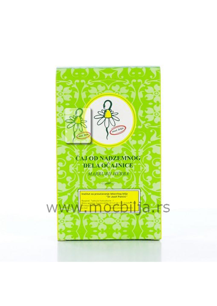 OČAJNICA , MACINA TRAVA Latinski naziv i familija : Marrubium vulgare L. (Lamiaceae)Opis : Biljka je gorkog ukusa i neprijatnog mirisa. Stabljika je uspravna, prekrivena belim maljama, listovi su okruglasto jajasti, liska je naborana i tupo nazubljena. Mladi listovi su gusto obrasli dlakama, kasnije ogole sa lica. Cvasti su skupljene u pazuhu listova u loptaste, razmaknute pršljenove. Cvetovi su sitni, krunica je bela pokrivena maljama. Raste u srednjoj Evropi, Mediteranu, Maloj Aziji, na Kavkazu, u Mesopotamiji, na sušnim livadama i pašnjacima.Kao lekoviti deo biljke koristi se : Osušen hadzemni deo biljke (Marrubii herba)Hemijski sastav : Herba očajnice sadrži flavonoide, pirolidinske alkaloide, do 1% diterpena, etarsko ulje i tanine.Upotreba : Gorke materije herbe očajnice deluju na podsticanje apetita, podstiču lučenje žuči, olakšavaju varenje, olakšavaju iskašljavanje.Takođe se koristi : U narodnoj medicini za regulisanje menstrualnog ciklusa i kod neplodnosti u ženaOgraničenja u upotrebi : Ne preporučuje se upotreba tokom trudnoće i dojenja Način pripreme i upotrebe čaja : Jednu kafenu kašičicu herbe očajnice preliti šoljom (200ml) ključale vode, ostaviti da stoji 10 minuta, procediti. Piti 2-3 puta dnevno po jednu šolju čaja pre obroka.