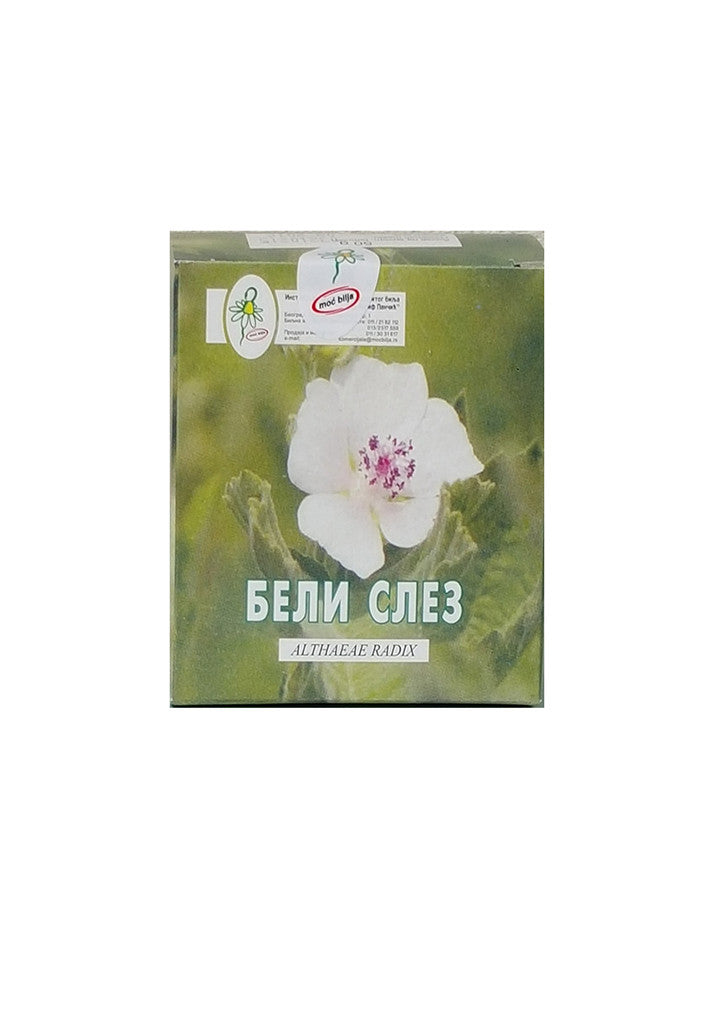Latinski naziv i familija : Althaea officinalis L. (Malvaceae)Opis : Koren je debeo, razgranat, gusto prekriven mekim, belim dlakama. Stabljika je uspravna, a listovi trouglasti, plitko urezani, gusto pokriveni sjajnim dlakma. Cvetovi su pojedinačni ili u kratkim grozdovima. Listići spoljne čašice su dlakavi i šiljati, čašični listići su jajasti, a krunični listići su trouglasti, svetloružičasti ili beli. Raste u umerenom pojasu Evroazije, po vlažnim livadama, pored reka, na obodima poplavnih šuma.Kao lekoviti deo biljke koristi se : Osušen koren (Althaeae radix) ili list (Althaeae folium)Hemijski sastav : Koren belog sleza sadrži sluzi, asparagin, kalcijum oksalat, pektine, skrob, tanin, fenolne kiselineUpotreba : Aktivni sastojci belog sleza povoljno utiču na smirenje kašlja. Koristi se i za oblaganje nadražene kože i sluzokože disajnih organa i organa za varenje, i kao sastojak čajnih mešavina kod upala mokraćnih putevaNeželjeni efekti i interakcije sa lekovima : Neželjeni efekti nisu poznati. U slučaju istovremene upotrebe sintetskih lekova, sluzi iz belog sleza mogu umanjiti njihovu resorpciju.Način pripreme i upotrebe čaja : Jednu supenu kašiku iseckanog korena preliti sa 200 ml predhodno prokuvane i ohlađene vode i uz povremeno mućkanje ostaviti 30-60 minuta a zatim procediti kroz tanak sloj pamuka. Više puta dnevno piti pripremljeni napitak po želji zaslađen medom.
