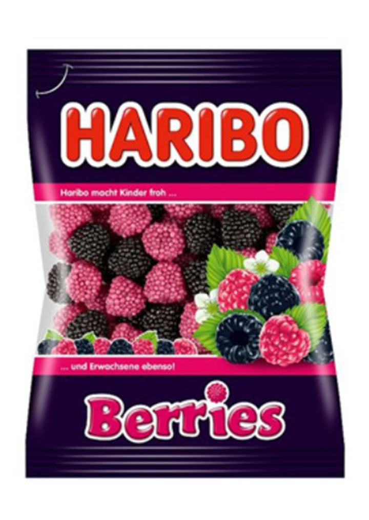 Every bag of HARIBO Berries contains a small bushel of red and black berries right off a HARIBO berry bush! These chewy gummies are a fun combination of soft and crunchy for double the fun.Serving Size: 7 pieces (29g) Calories 110 Fat 0g of which saturates 0.1g Total Carbohydrates 26g Sugars 22g Protein <1g Sodium 0mg